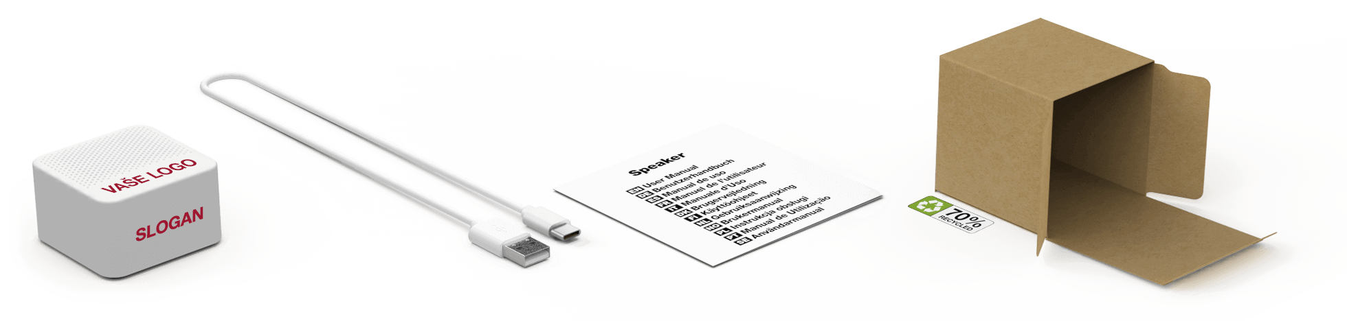 Bluetooth® jméno vidí uživatelé na svých smartphonech nebo tabletech, když je párují se svým audio produktem. Toto jméno můžeme upravit na název vaší značky, a tak rozšířit povědomí o vaší organizací. Pokud nemáte zájem o tuto službu, bude audio produktu přiřazeno výchozí jméno jako: 'Promo Audio'.Příslušenství