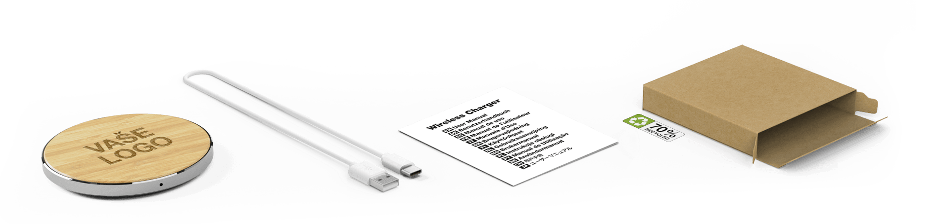 Povrchová úprava z přírodního bambusového dřeva vytváří výrazný kontrast s živými obrázky značky a slaďuje vaši společnost s ekologickými hodnotami. Rozhodněte se pro naši službu individuálního pojmenování a vytvořte si personalizované bezdrátové nabíječky pro nástup klientů nebo zaměstnanců. Případně můžete své jednotky očíslovat pro sběr dat na příští veletrh nebo akci. Bezdrátová nabíječka Ring je také součástí našich nových merch balíčků, které jsou ideální jako dárky pro zaměstnance a klienty!