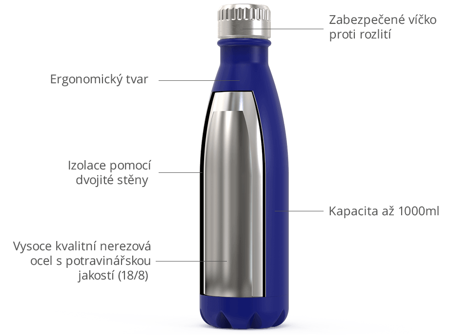 Dvoustěnná konstrukce je vyrobena z vysoce kvalitní nerezové oceli s vakuovou izolací, která udrží nápoje horké po dobu 12 hodin nebo studené nápoje studené po dobu 48 hodin.