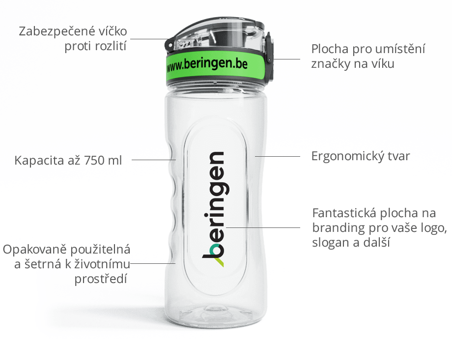 Láhev na vodu Pacific je vyrobena z odolného průhledného plastu Tritan&trade a pyšní se ergonomickým úchopem a bezpečnostním uzávěrem odolným proti rozlití. Vaše logo a informace o společnosti budou vytištěny vertikálně v rámci velké brandingové oblasti na této lahvi bez BPA. Láhev na vodu Pacific je vynikající volbou pro ty, kteří jsou vždy v pohybu, a skvělý model na události a jako dárek pro zákazníky.