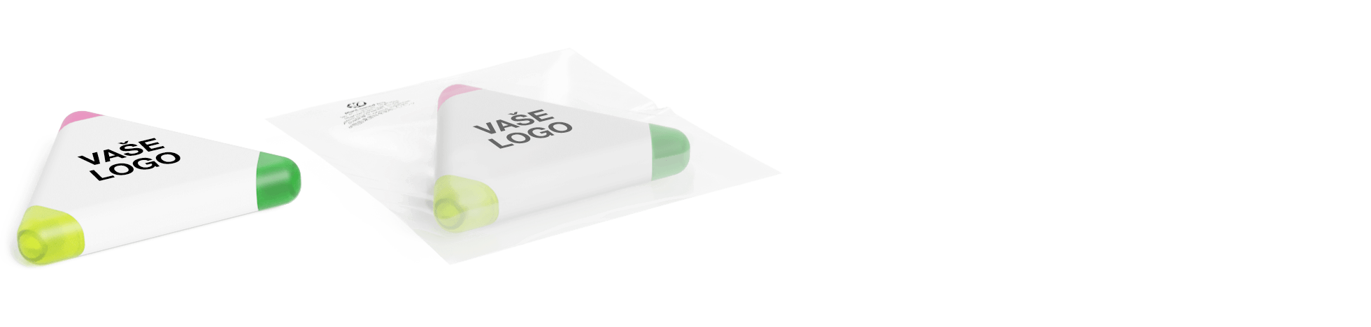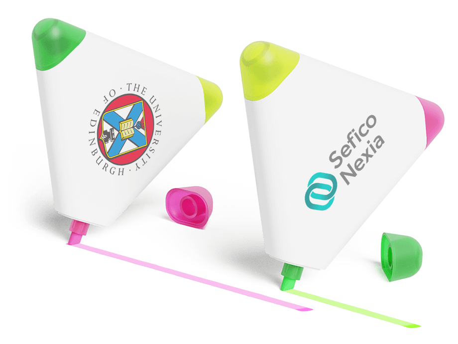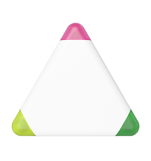 Naše zvýrazňovače Triple se pyšní třemi různými zvýrazňovači v jednom modelu – žlutým, zeleným a růžovým. Díky nápadnému trojúhelníkovému tvaru se jedná také o velmi oblíbený dárkový předmět. Na obě strany zvýrazňovače Triple můžeme přidat vaše logo, slogan a další informace, což vám zajistí fantastické zviditelnění značky na produktu, který si zákazníci ponechají a budou jej často používat.