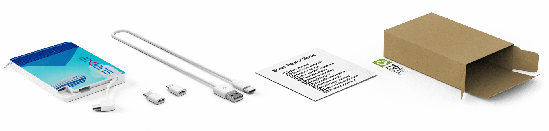 Má také vestavěnou ochranu proti přebití, aby byla vaše zařízení během nabíjení v bezpečí. Jelikož je kompatibilní se všemi chytrými telefony a tablety, představuje perfektní záložní variantu pro nečekaně dlouhé dny mimo kancelář. Vylepšete svou reklamní powerbanku Solar Card o sortiment příslušenství, jako je například klip s karabinou pro snadnou a bezpečnou přepravu mimo kancelář, nebo ji vylepšete z bezplatného dárku na veletrhu na firemní dárek s naší magnetickou power bankou Box.