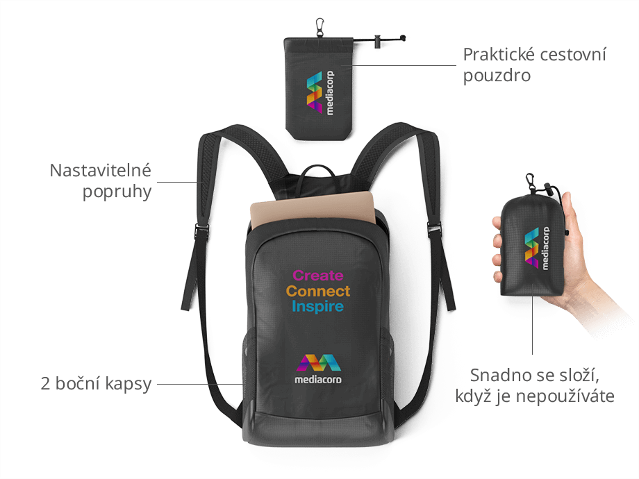Tento lehký batoh je vyroben z odolného polyesteru a má praktickou skládací konstrukci, která umožňuje jeho snadné sbalení do vlastního vaku na věci, pokud není používán. To z něj dělá ideálního společníka na cesty pro vaše zákazníky a zaměstnance, ať už dojíždějí do práce, nebo si užívají víkendovou túru.